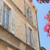 Cet immeuble de 2 étages revêt l’architecture typiquement nîmoise avec sa façade en parement de pierre, ses volets persiennés et les gardes corps en fer forgés de ses fenêtres.